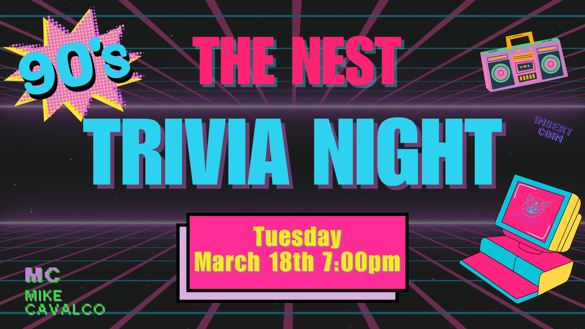 Get ready to take a trip down memory lane! Join us on Monday, March 18th, for a totally rad 90s-themed Trivia Night hosted by the one and only Mike Cavalco.