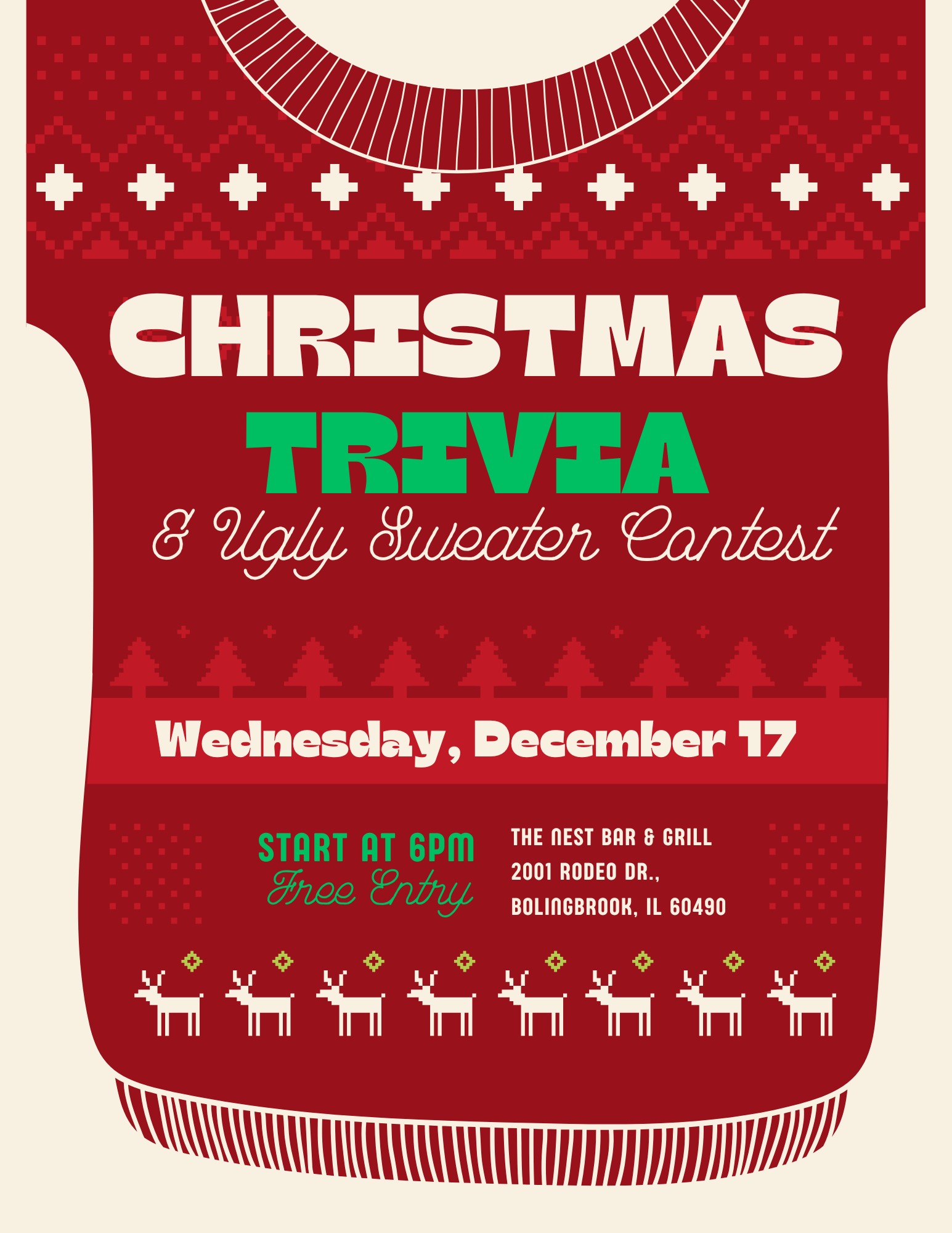 Get into the holiday spirit with a festive night of Christmas Trivia & an Ugly Sweater Contest at The Nest Bar & Grill! Join us on Wednesday, December 17 at 6 PM for a cheerful mix of friendly competition, holiday laughs, and unforgettable outfits.