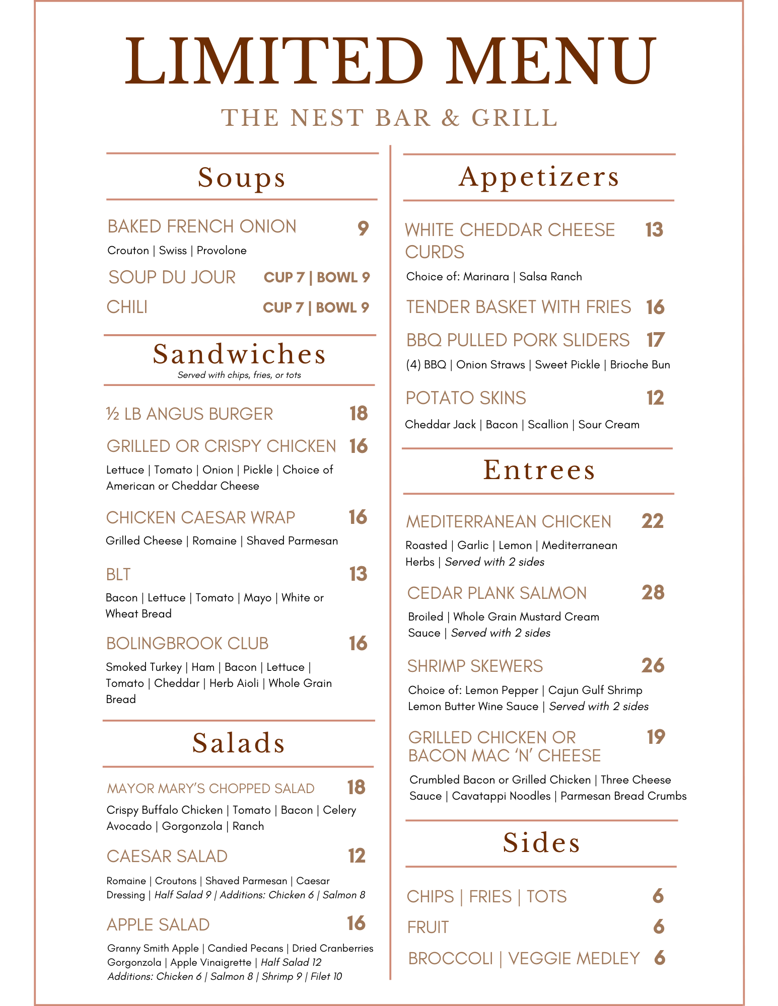 The Nest Bar & Grill – Limited Menu