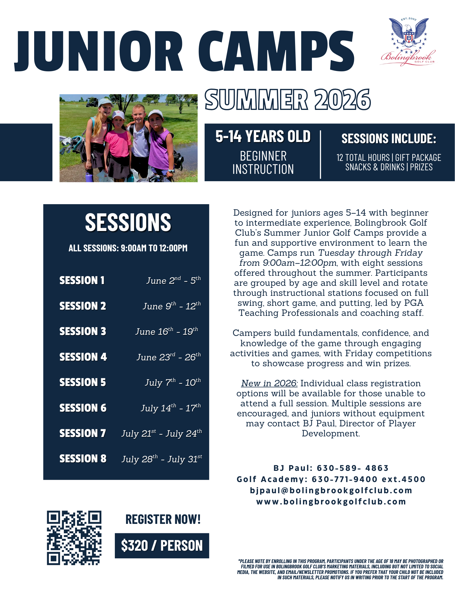 For questions, contact our Director of Player Development, BJ Paul, PGA at (630) 589-4863, call 630-771-9400 ext. 4500, or email bjpaul@bolingbrookgolfclub.com.